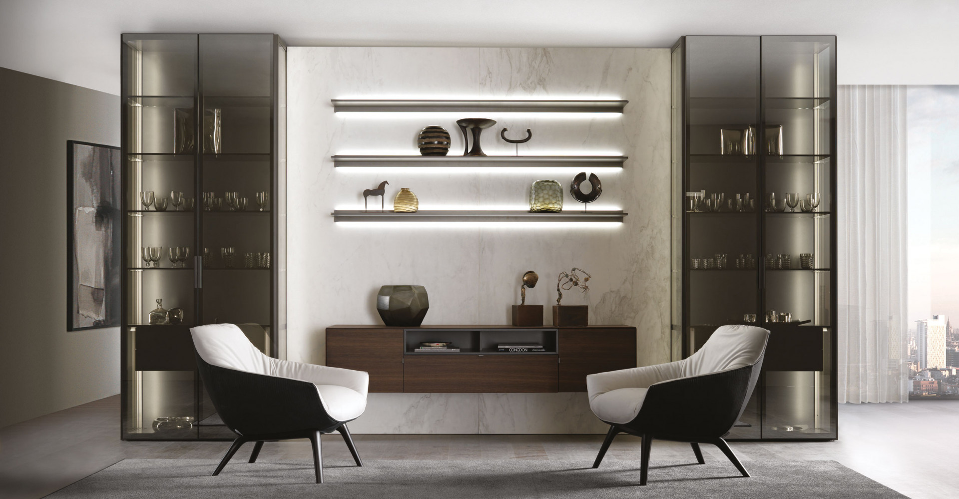 The Dorya shelf is a slim black metal framework of interlocking open boxes – sculptural wall storage that pops against a warm terracotta feature wall and open coastal light.