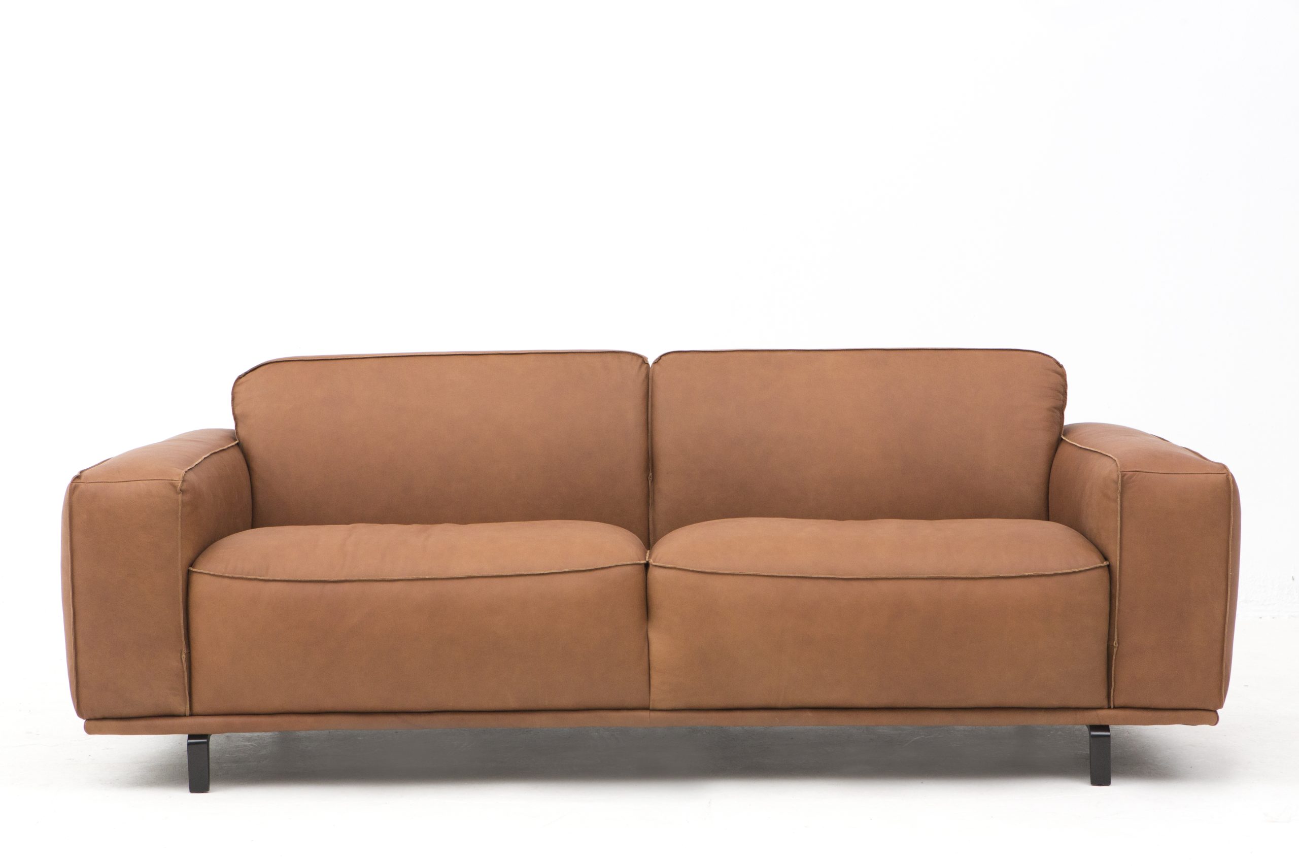 The Merdon sofa wraps deep, rounded arms and a sculptural taupe leather shell in neat top-stitching for a soft, gallery-quiet statement that scales from intimate seats to generous layouts.