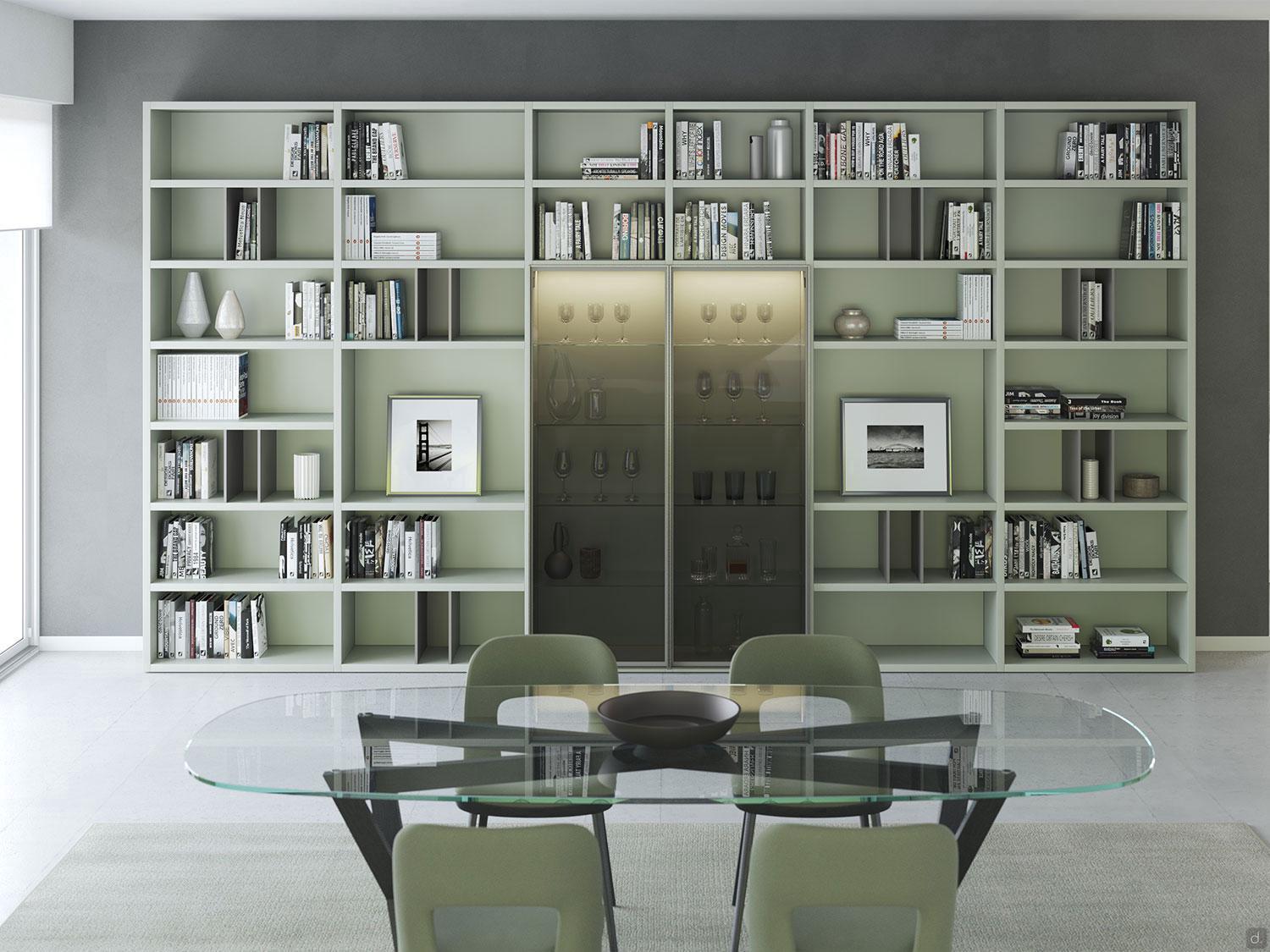 A slim dark grid with warm backlighting and a central focal bay, Rivo turns the wall into a luminous, minimalist composition for books and objects.